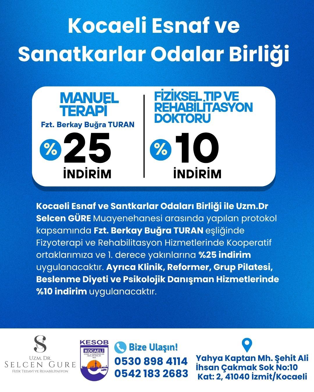 Kocaeli Esnaf ve Sanatkârlar Odaları Birliği ile Uzm. Dr. Selcen GÜRE Muayenehanesi arasında yapılan protokol kapsamında;